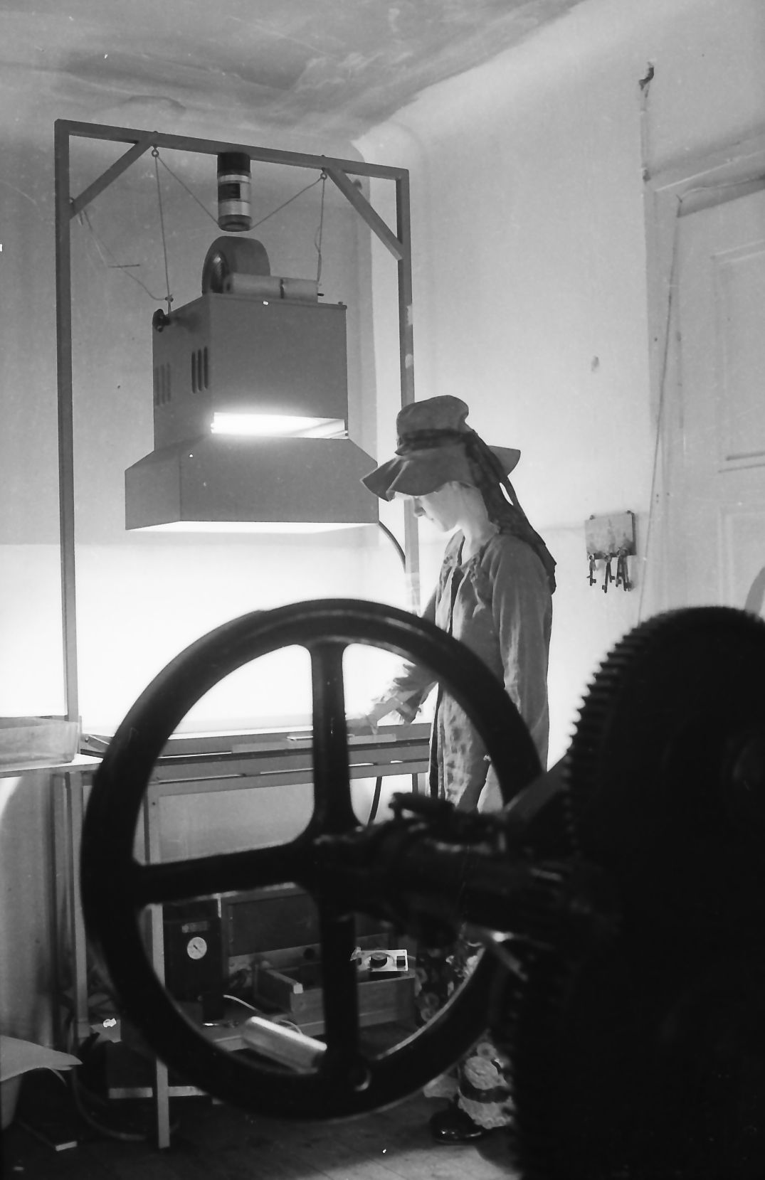 Olga beim Belichten einer Offset Druckplatte; im Vordergrund die grosse Papierschneidemaschine